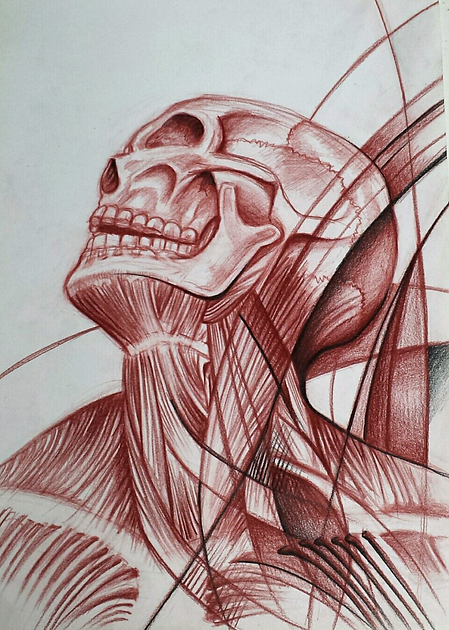 This modern depiction of the muscular and skeletal structures of the face was made as a precursor of the full Anatomical study displayed on this website. It has been donated to the college I attended from 2015.